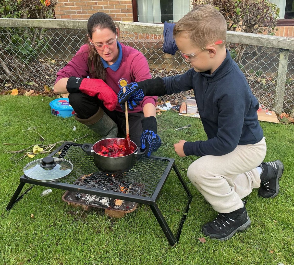 After this they gathered around the fire circle and reviewed the fire safety rules, which they all remembered. The children took turns to help Miss Titman make and cook the fruit stew, whilst the others had the challenge of building their own villages and creating defences to keep them safe. They are all looking forward to tasting the fruit stew, it smelt delicious when it was cooking.